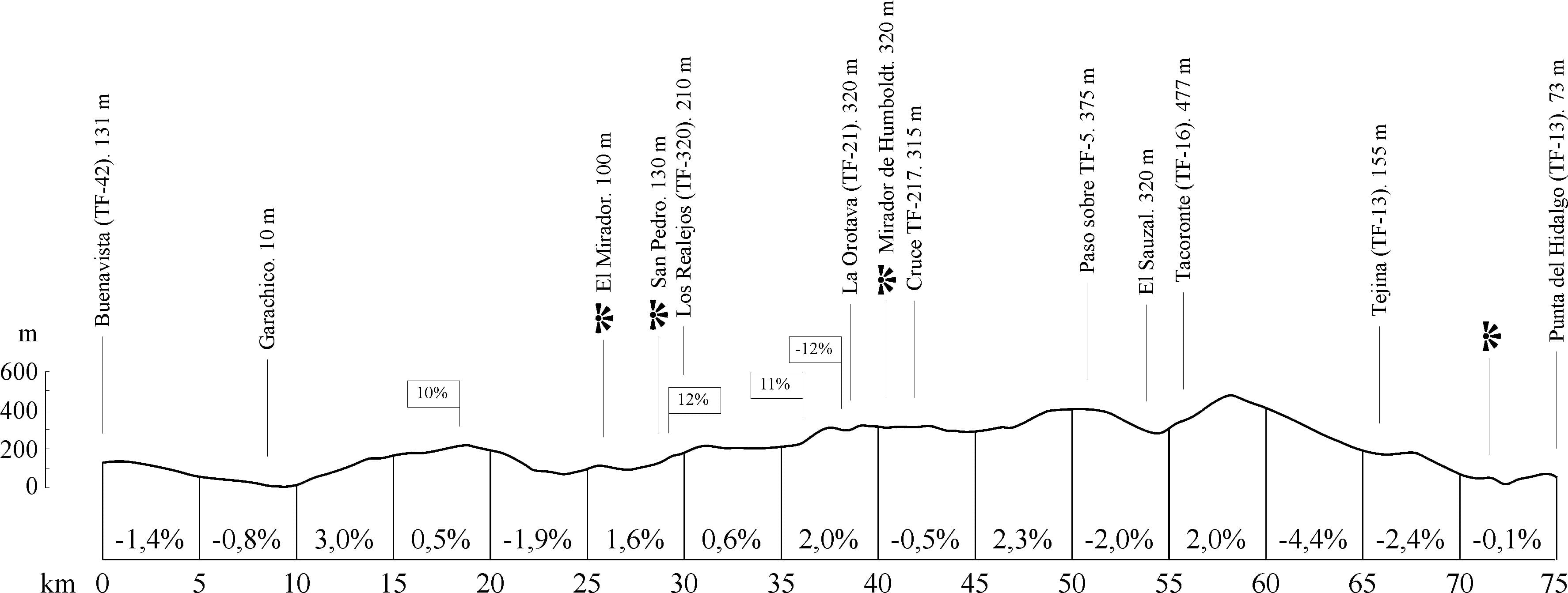 As you come to the town of Los Realejos, the TF-42 turns into the TF-5 motorway. To avoid this road, bear left to take the TF-320 at km 30 (mile 18.6), once you come to the roundabout at the entrance to Los Realejos. Further ahead, the road will cross the motorway as it takes you to La Orotava, which you will access from Calle Leonor Monteverde. After a short stretch that crosses the town centre, the route continues along the TF-21. The Humboldt lookout point awaits you at km 40.7 (mile 25.3), affording spectacular views over the La Orotava valley. At km 41.6 (mile 25.8), the TF-21 comes to an end and your journey will continue along the TF-217 to La Matanza. Here, the road crosses a bridge over the TF-5 motorway. Once you reach the roundabout, you will descend just over a hundred metres and turn right to take the Las Breñas road (TF-1224). The name of that road will then change to Los Ángeles and will lead you to the village of El Sauzal at km 54 (mile 33.5), at an altitude of 320 m (1,050 ft). From this point on, you will come to a considerable slope with an average gradient of 7% until you reach the roundabout on the El Pris intersection, at an altitude of 477 m (1,565 ft). This is the highest point on the route. You will then have to take the TF-16 towards Valle de Guerra and Tejina, as signposted. The stretch that takes you to the town of Tejina is a descent with an average gradient of 5%.