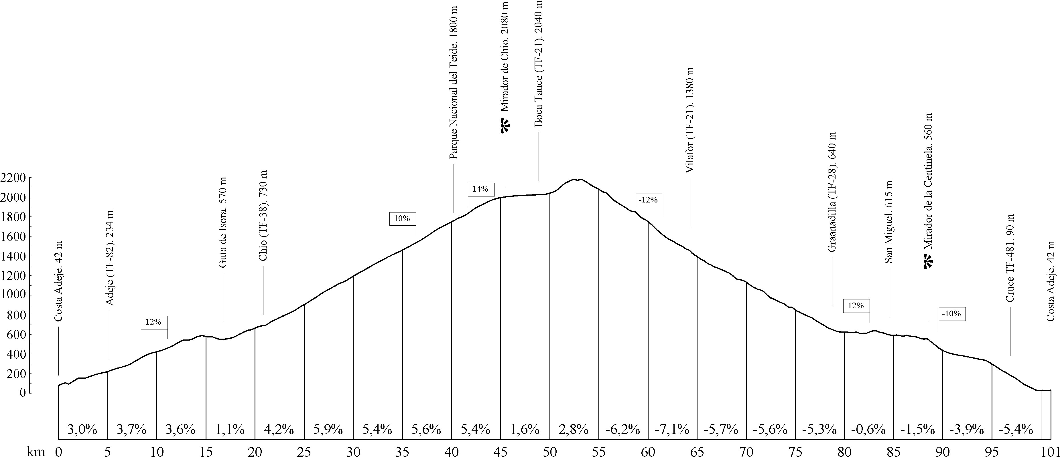 The Chío lookout point awaits you at km 45.5 (mile 28.3), where you can stop to take in the fabulous views of Pico Viejo. Here, the climb eases a little, and there are a few flat stretches and a slight descent. Km 48.6 (mile 30.2) brings you to another strategic point on the route: Boca Tauce, a crossroads where you should make a right turn to take the TF-21 towards Vilaflor and Granadilla. From here, a steady descent begins which continues until the end of the route, with a gradient of up to 11%. During your trip, your hard work will be rewarded with fantastic views from a variety of spots.